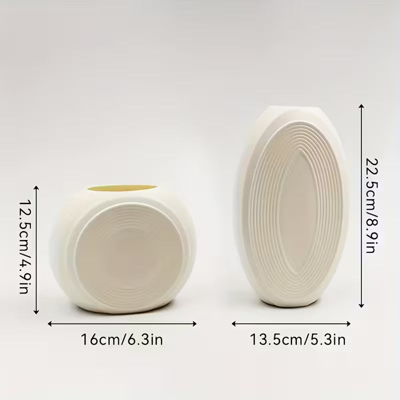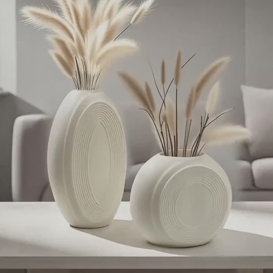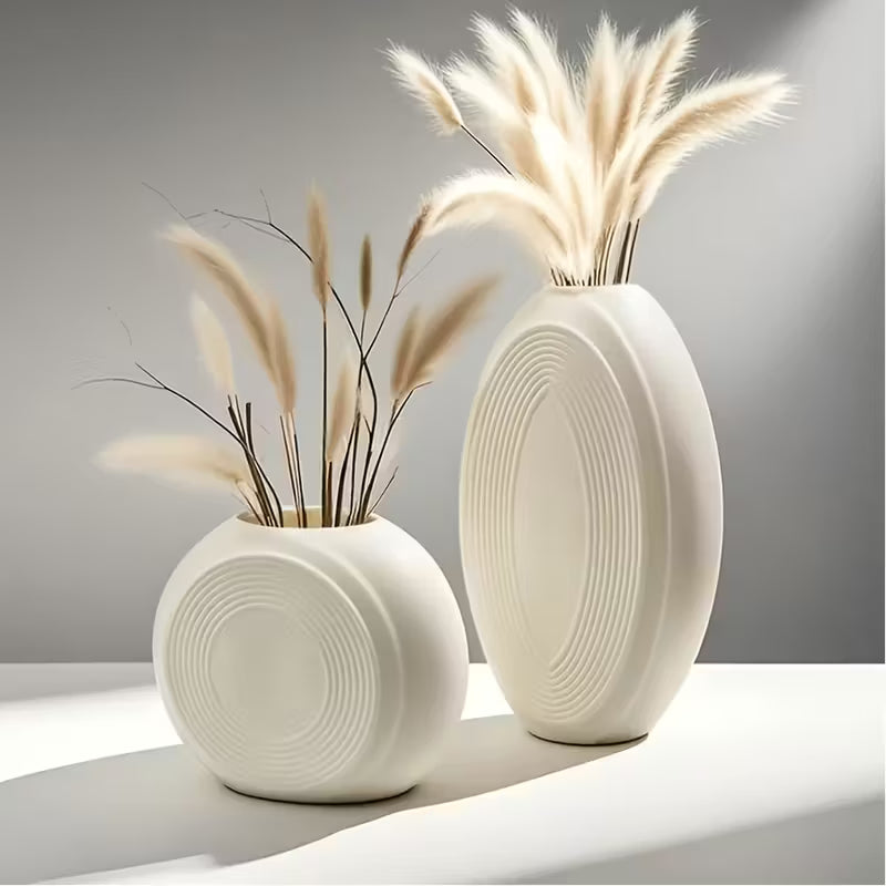 Две цилиндрические вазы с волнистыми краями и приятной матовой текстурой прекрасно сочетаются между собой, добавляя интерьеру современный, но тёплый акцент.